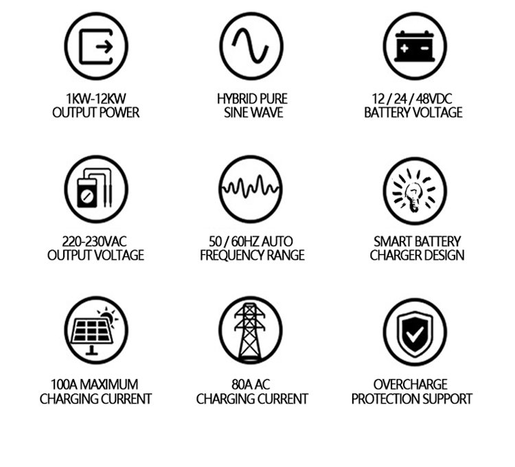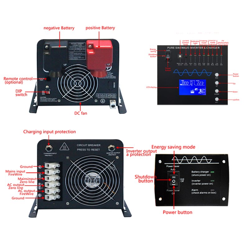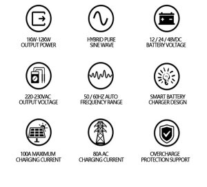 Один из самых мощных инверторов на рынке. Встроенное зарядное устройство с выбором типа аккумуляторов и током зарядки 75Ампер! Подойдет для системы с АКБ на 400Ач+ На выходе чистый синус и в пике может выдать до 9кВт (пару секунд). При подключении внешней 220В включается ЗУ и пропуск тока к потребителям