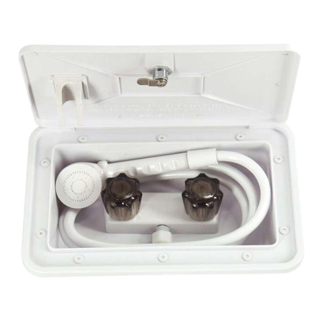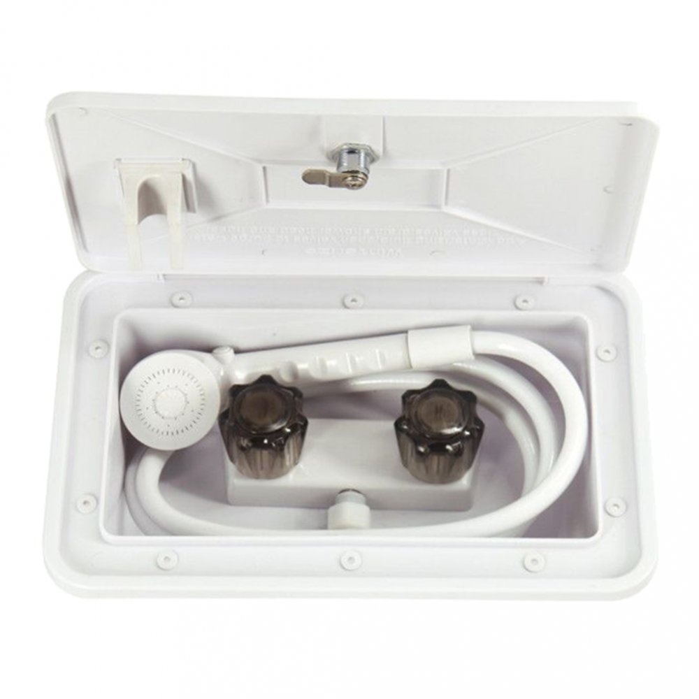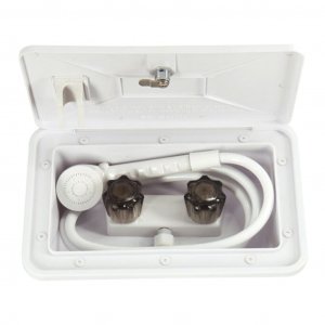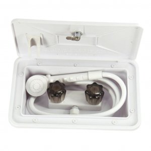 Блок для организации уличного душа включающий все нужное в одном наборе: корпус душа, краны для подачи горячей и холодной воды а так же лейку со шлангом. Блок запирается дверцей на ключ, так что можно делать его даже в боковых стенах дома