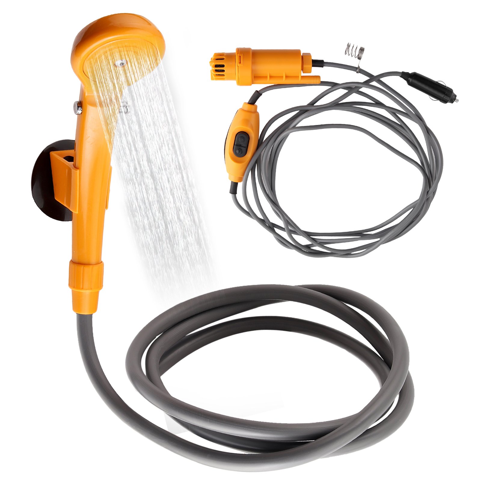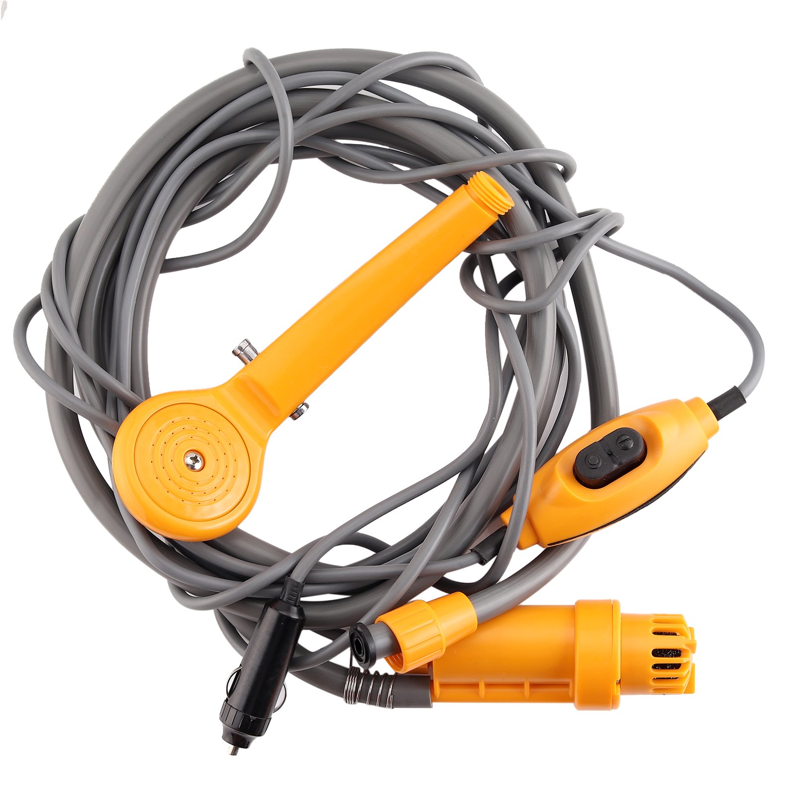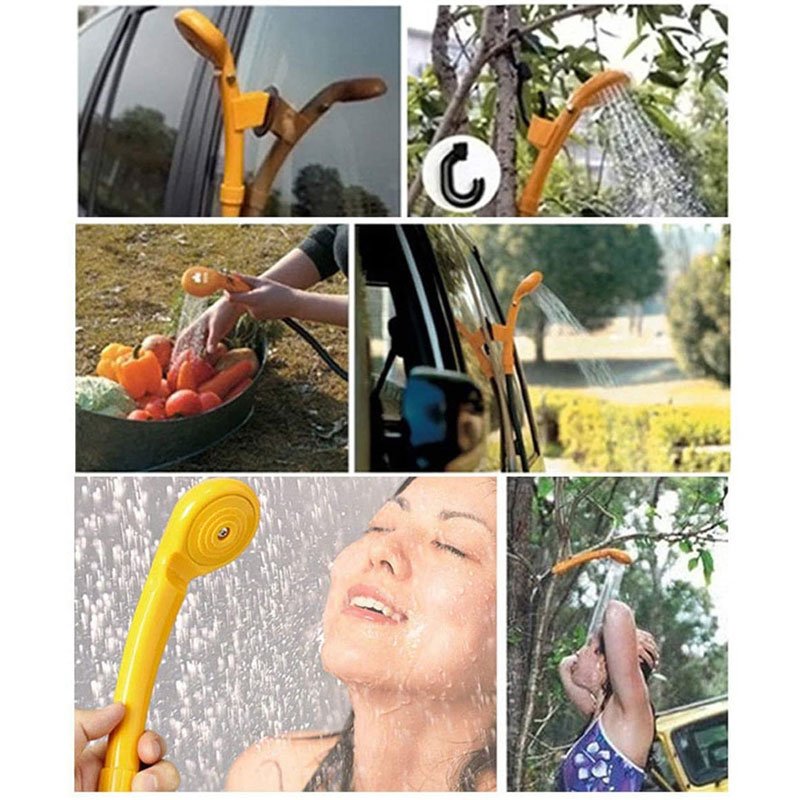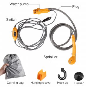 Набор для уличного летнего душа, включающий в себя душевую лейку, погружной насос и выключатель. Втыкается в прикуриватель, кидаете насос в ведро и быстрый душ готов. Отдельно можно докупить раскладную душевую палатку для приватности
